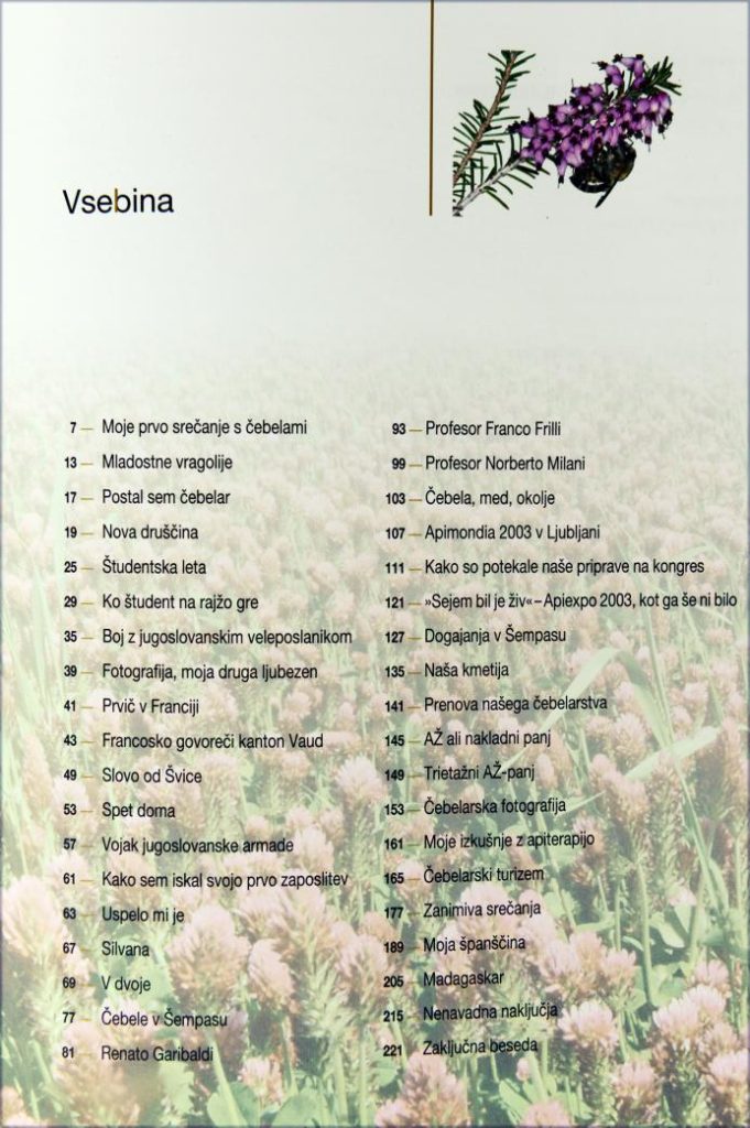 Veselje jo je vzeti v roke in prebrati. V njej sledimo številnim epizodam njegovega zanimivega življenja. Izkušnje in bogato čebelarsko znanje, ki si ga je pridobil pri svojem delu s čebelami ter v več kakor šestdesetletnem druženju s čebelarji doma ter po svetu, sedaj na najlepši način predstavlja slovenskim bralcem.