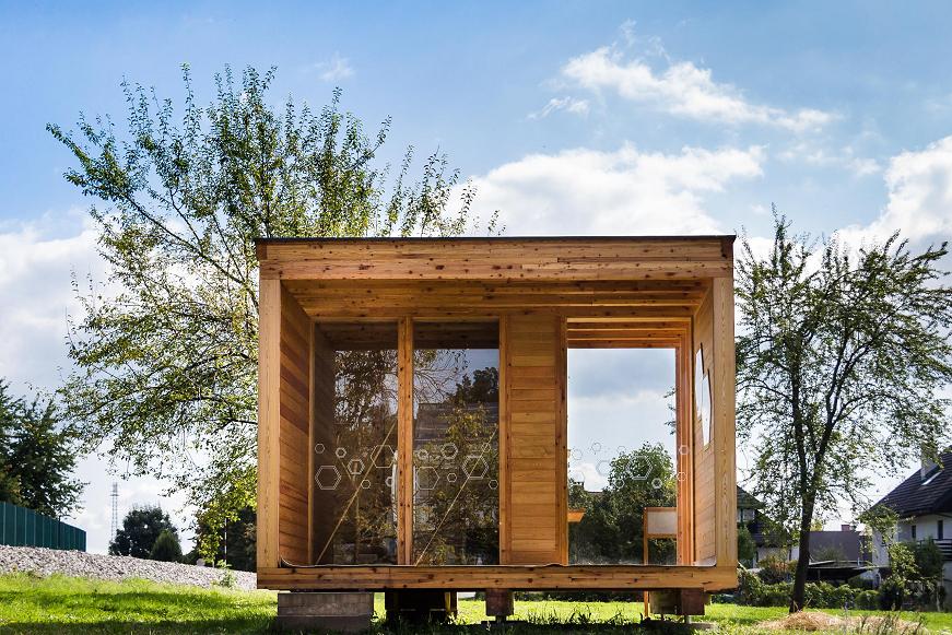 Enoti ločuje steklena pregrada, ki obiskovalcem omogoča varen bližnji pogled na dogajanje v čebelnjaku. Konstrukcija paviljona je lesena (macesen) in postavljena na točkovne betonske temelje. Na notranji strani je zaprta z deskami, navzven pa je viden ritem stebrov.