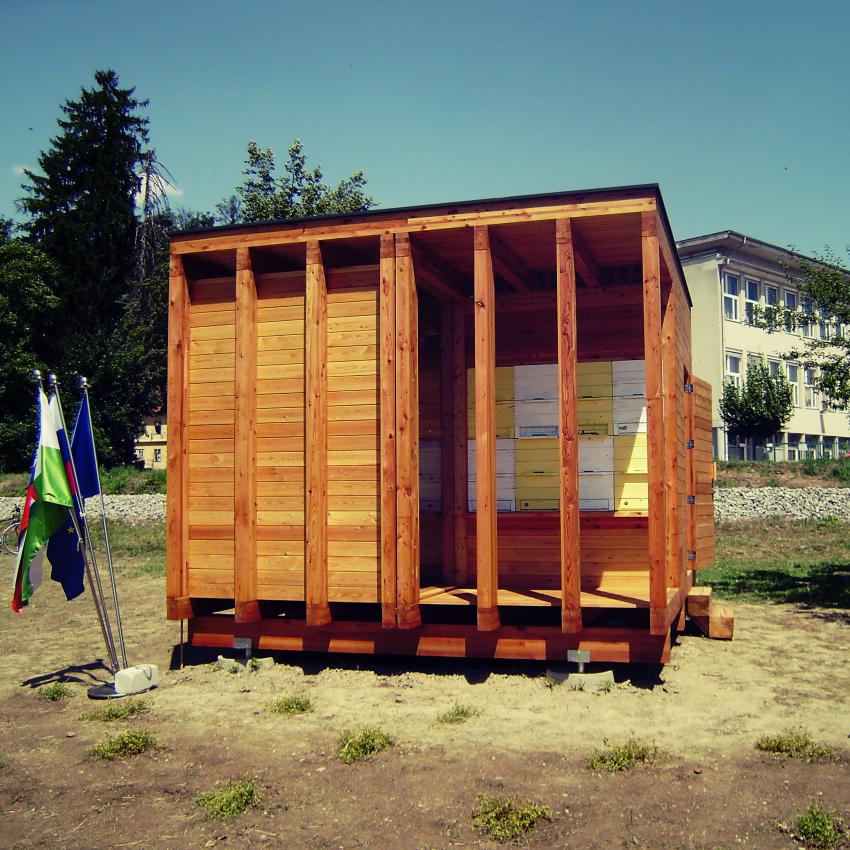 “Paviljon je sestavljen iz dveh delov, prostora za opazovalce ter prostora za čebele in delo z njimi. Enoti ločuje steklena pregrada (z diskretno graviranimi vzorci), ki obiskovalcem omogoča varen bližnji pogled na delovanje znotraj čebelnjaka. Konstrukcija paviljona je lesena in postavljena na betonske podstavke. Na notranji strani je zaprta z deskami, navzven pa je viden ritem stebrov. Med konstrukcijo sta brez dodatnih profilov vstavljena dva večja kosa kaljenega stekla. Predvidena je tudi zelena streha.”