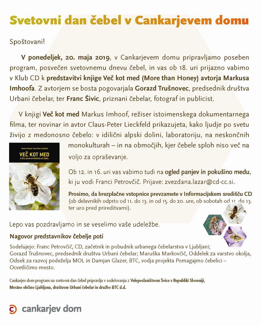 Na letošnji svetovni dan čebel, v ponedeljek, 20. maja 2019, vas ob 18. uri prijazno vabimo v Klub CD k predstavitvi knjige Več kot med avtorja Markusa Imhoofa.