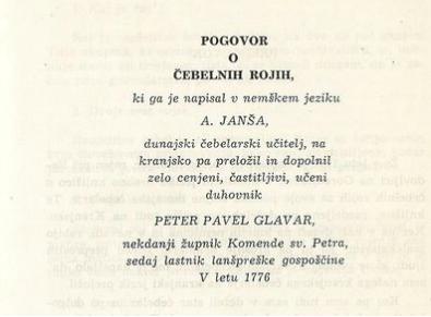Na spletu si je mogoče ogledati oziroma prebrati prvo knjigo o čebelarjenju v slovenščini, Pogovor o čebelnih rojih, ki jo je iz nemške predloge Antona Janše (1771) pet let po izidu izvirnika prevedel Peter Pavel Glavar (1776).